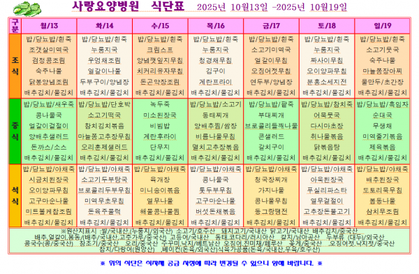 사랑요양병원 10월 셋째주 식단표