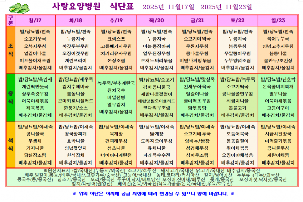 사랑요양병원 11월 셋째주 식단표